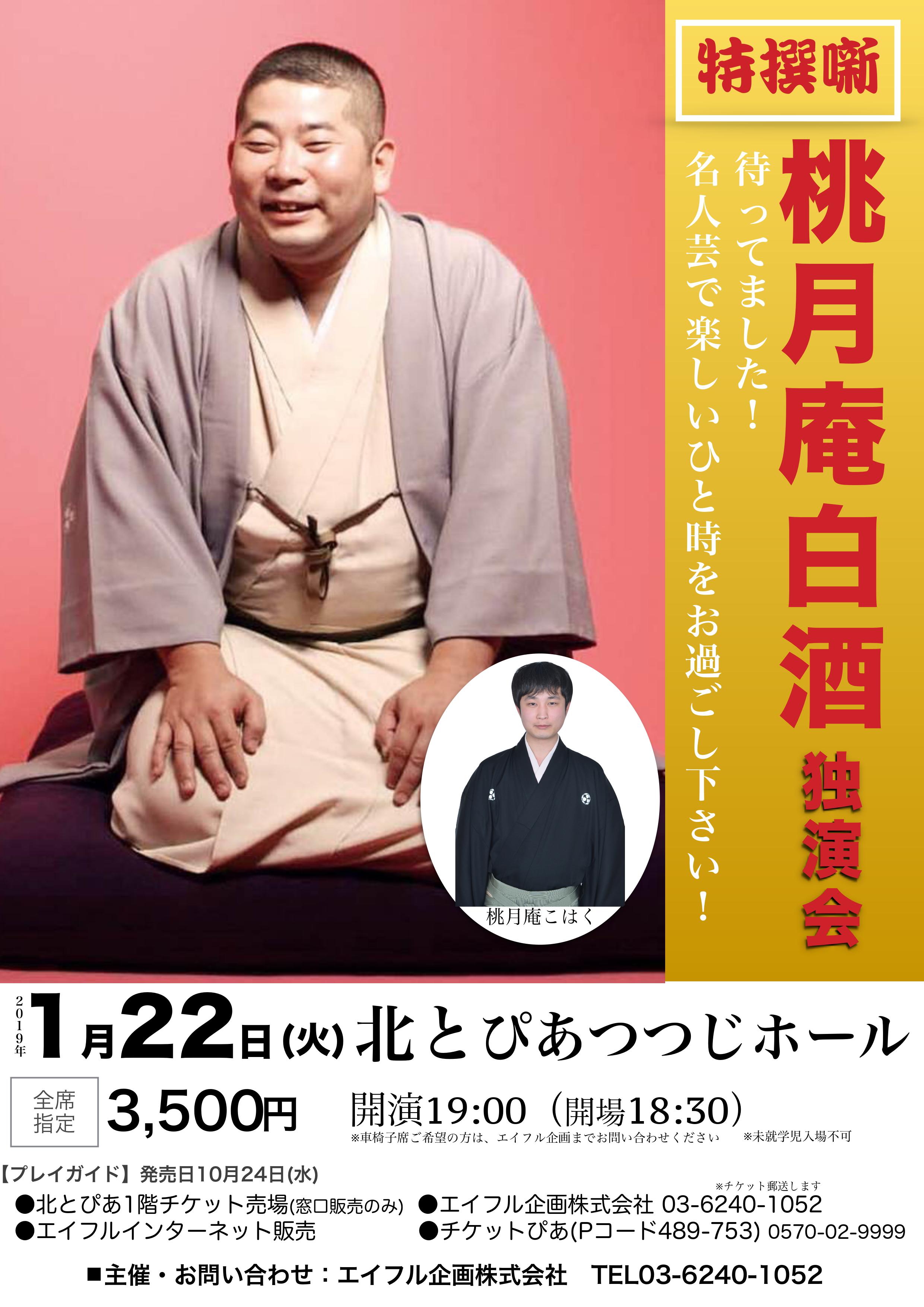 H31.1.22(火)特撰落語会 桃月庵白酒 独演会 2019.01.22 (火) 北とぴあつつじホール (東京都) 19:00~ H31.1.22(火)特撰落語会 桃月庵白酒 独演会 (190122) 販 売 価 格 3,500 円 在 庫 状 態 在庫有り 会 場 東京都 :北とぴあつつじホール 公 演 日 2019年01月22日 開場 18:30 開演 19:00 一 般 発 売 日 2018年10月24日 出 演 者 桃月庵白酒 公演終了しました 公演カレンダーはこちら