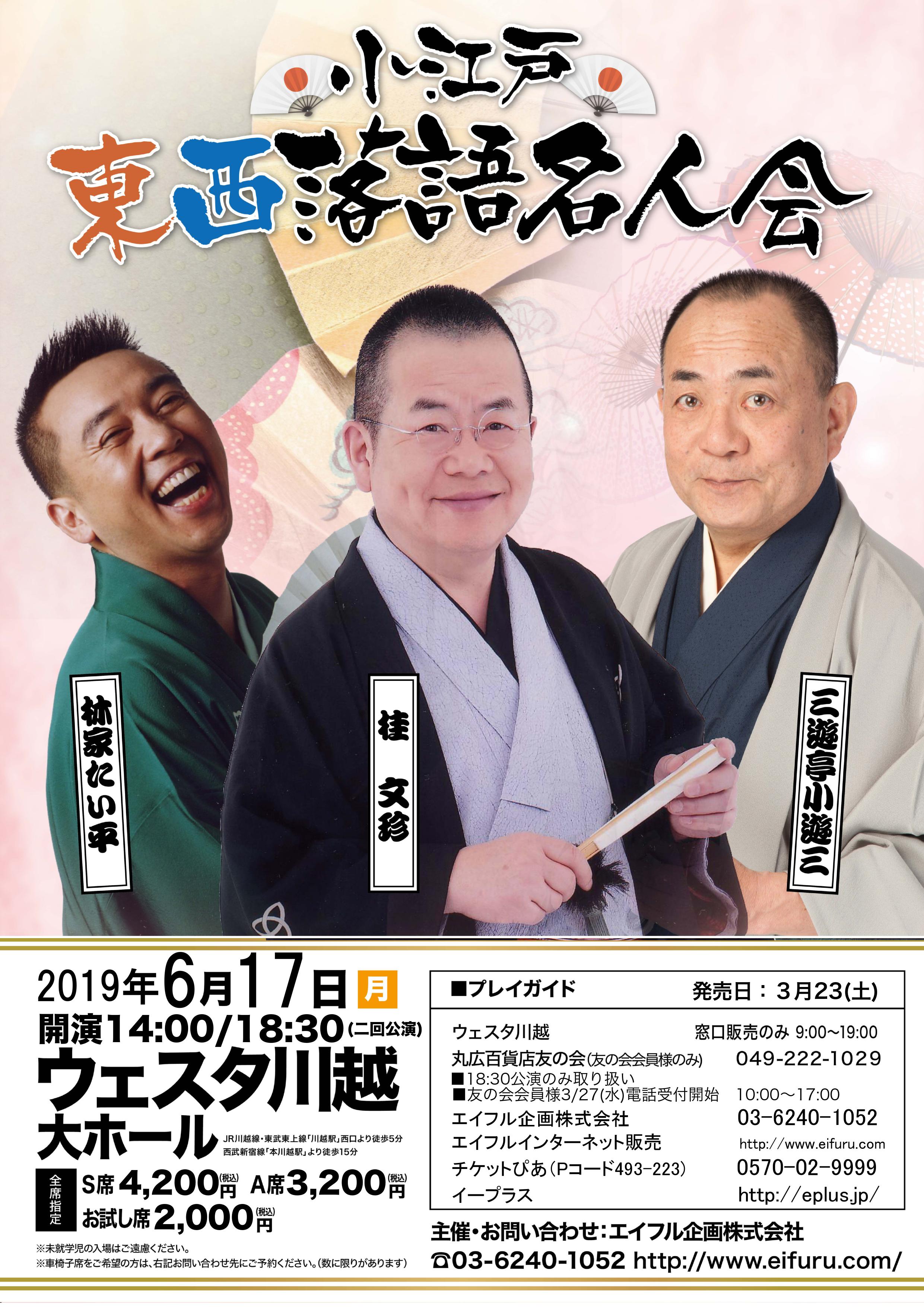 2019.6.17(月)18:30 小江戸 東西落語名人会 小遊三・文珍・たい平 2019.06.17 (月) ウェスタ川越 (埼玉県) 18:30~ 2019.6.17(月)18:30 小江戸 東西落語名人会 小遊三・文珍・たい平 (1906172) 販 売 価 格 4,200 円 在 庫 状 態 在庫有り 会 場 埼玉県 :ウェスタ川越 公 演 日 2019年06月17日 開場 18:00 開演 18:30 一 般 発 売 日 2019年03月23日 出 演 者 三遊亭小遊三桂文珍林家たい平 公演終了しました 公演カレンダーはこちら