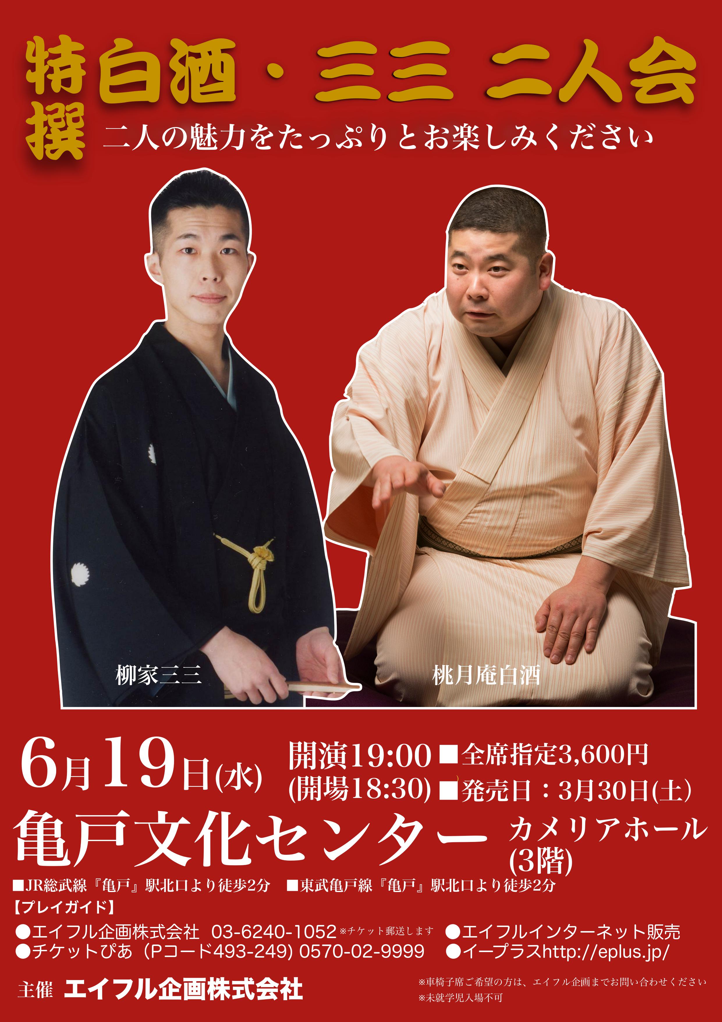 2019.6.19(水)特撰落語会 白酒・三三 2019.06.19 (水) 亀戸文化センター (東京都) 19:00~ 2019.6.19(水)特撰落語会 白酒・三三 (20190619) 販 売 価 格 3,600 円 在 庫 状 態 在庫有り 会 場 東京都 :亀戸文化センター 公 演 日 2019年06月19日 開場 18:30 開演 19:00 一 般 発 売 日 2019年03月30日 出 演 者 桃月庵白酒柳家三三 公演終了しました 公演カレンダーはこちら